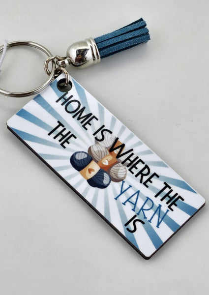 Keep your keys close and your yarn closer with our playful key fob! Featuring a tassel and the phrase "Home is where the yarn is!", this accessory is perfect for any yarn-lover. Never lose your keys again and show off your love for crafting at the same time.