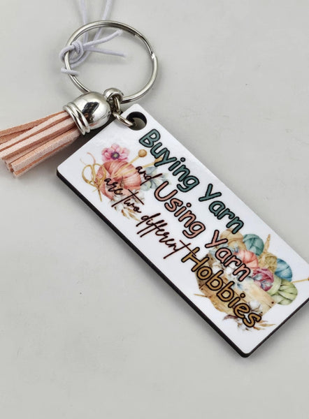 Get a playful reminder every time you grab your keys with these quirky Key Fobs! Featuring a tassel, these fobs are perfect for avid yarn-lovers. With a humorous saying, they'll make you smile while keeping your keys organized. A must-have for anyone who knows that "Buying Yarn & Using Yarn are two different Hobbies"!