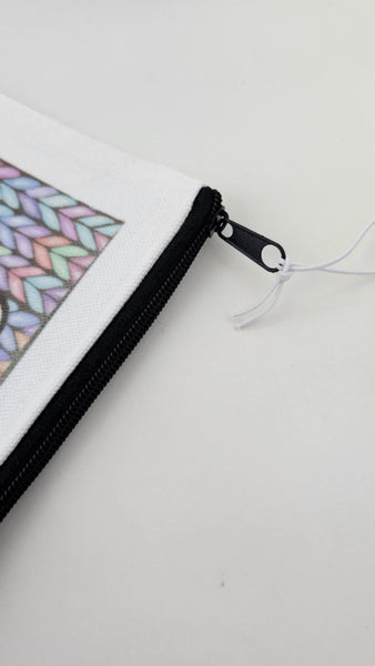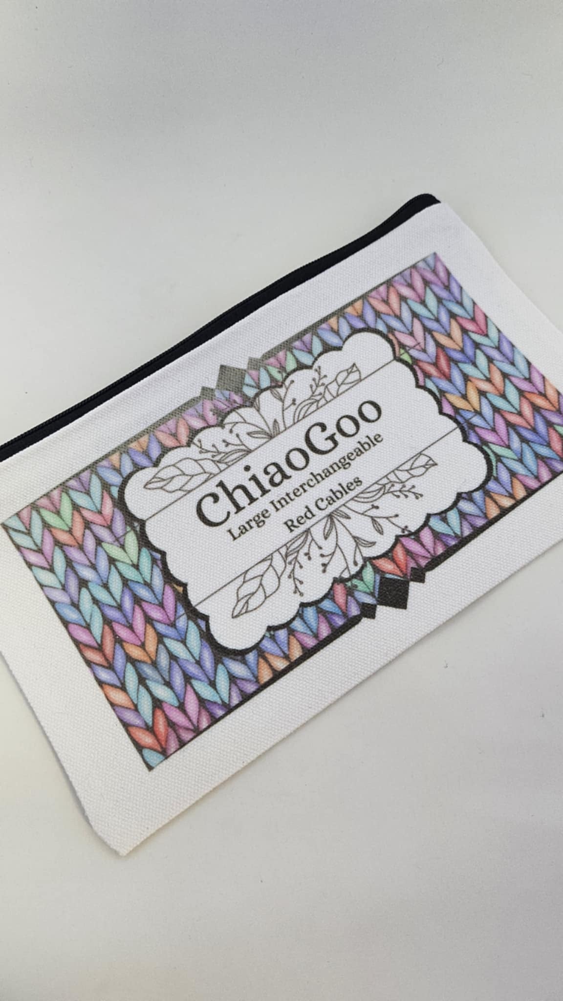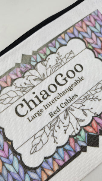 Keep your large Chiaogoo needle cables organized with our generously sized, sublimated canvas pouches. Featuring a fun and bright knit stitch pattern, these pouches are the perfect way to keep your knitting supplies in order. No more tangled cables!